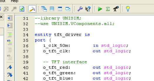 With some trial and error, I managed to get an initial design and display some color lines on the TFT screen (see VHDL file at the right side).