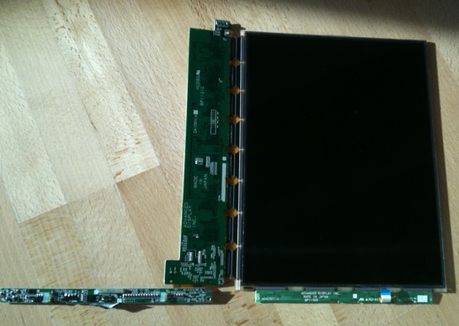 As a first step, I’ve disassembled the LCD panel. There are two main parts - the matrix with the 640 x 480 pixels with three circuit boards connected to it and a white, rectangular piece of plastic with the CCFL. The panel: